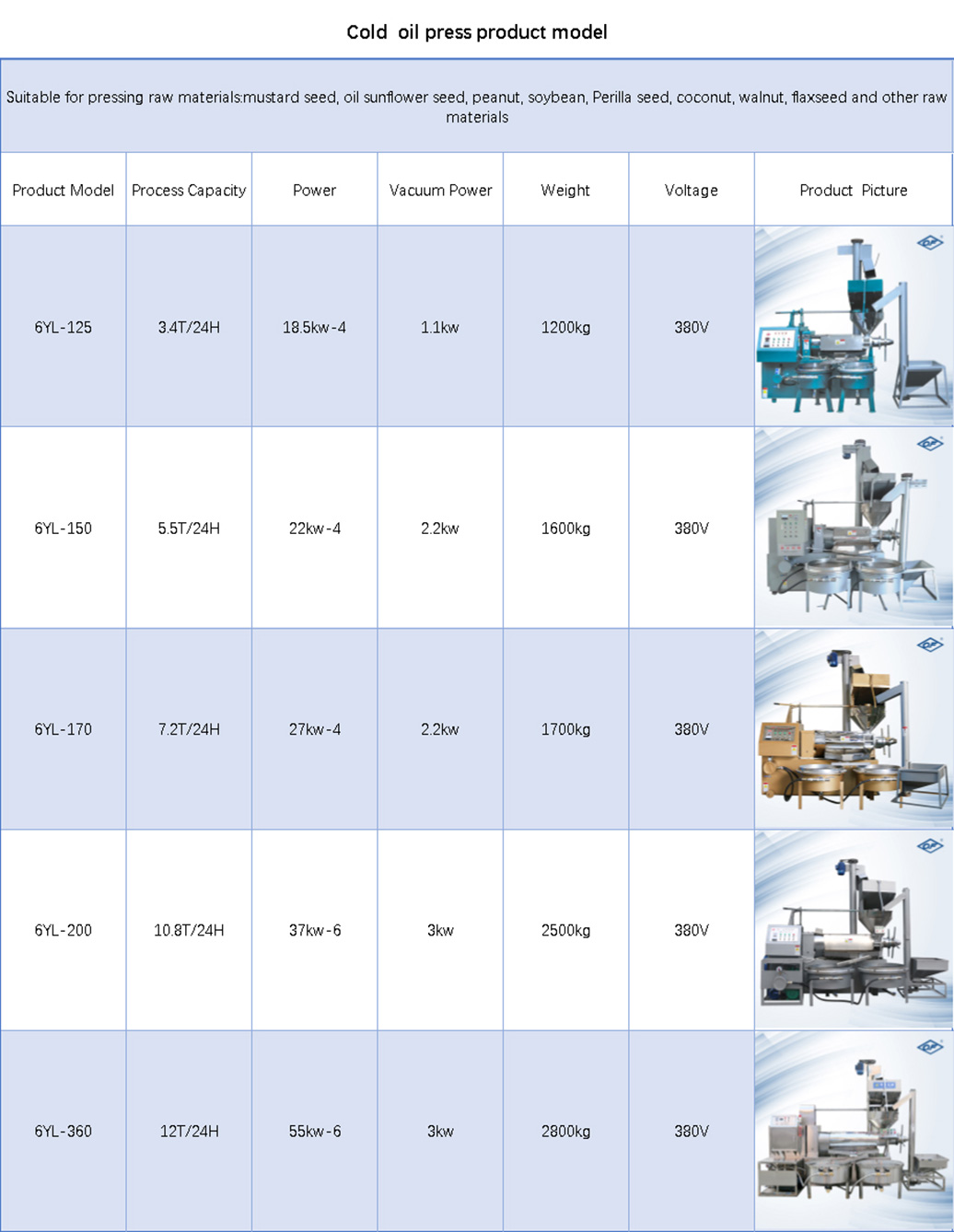 Equipment configuration: Oil press, raw material elevator, cake lifting machine, oil filter, power supply, motor, frame, etc.