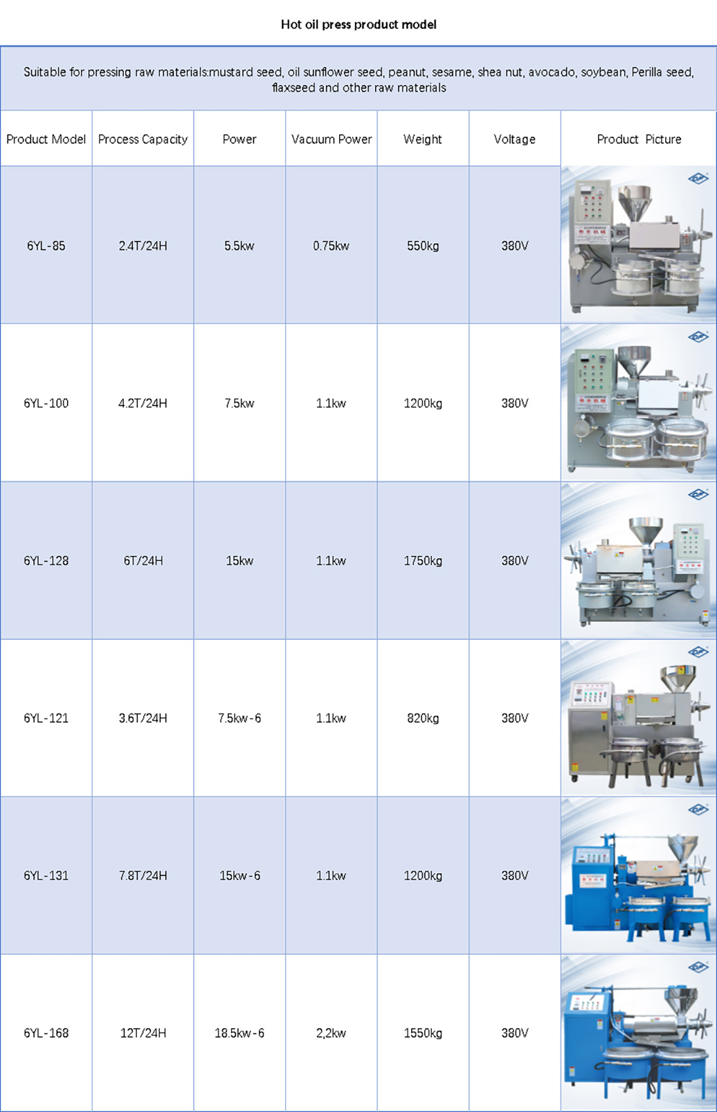Equipment configuration: Oil press, raw material elevator, cake lifting machine, oil filter, power supply, motor, frame, etc.