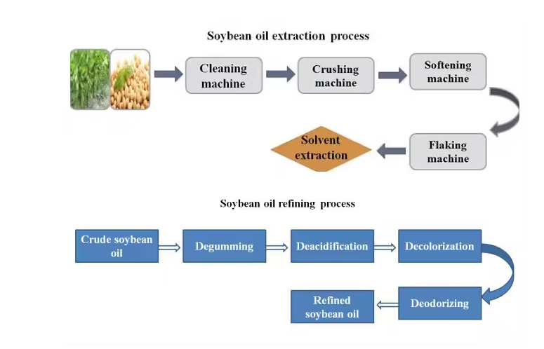 Soybean oil cleaning → screening → air separation → stone removal → magnetic separation → mud cleaning → Dust removal → soybean moisture regulation → crushing → softening → rolling → soybean extruding → solvent extraction → miscella treatment → miscella purification and preheating → miscella evaporation → miscella stripping → soybean crude oil (crude oil) → filtration → hydration degluing → alkali refining deacidification → decolorization → deodorization → finished oil