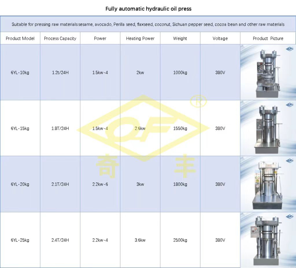 Equipment configuration: Oil press, raw material elevator, cake lifting machine, oil filter, power supply, motor, frame, etc.